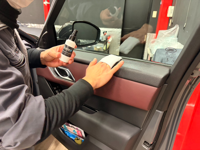 シートやドアパネルなどの内装を透明の保護膜でコーティング。飲み物のシミや擦れ、色移りなどを防ぎ、美しい状態を保ちます。