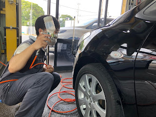 Gガードガラスコーティングは2層のコーティングになっており、1層目はスプレーガンによる吹き付けを行い、その上にトップコートを手塗りで行います。