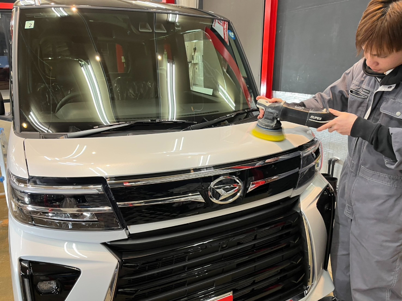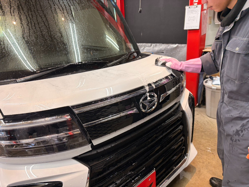 下地の磨きから洗車、コーティング塗布、そして専用ヒーターによる焼き付けまで、一台一台丁寧に作業を行っています。細部にまで手をかけることで、仕上がりの艶と耐久性が高まります。