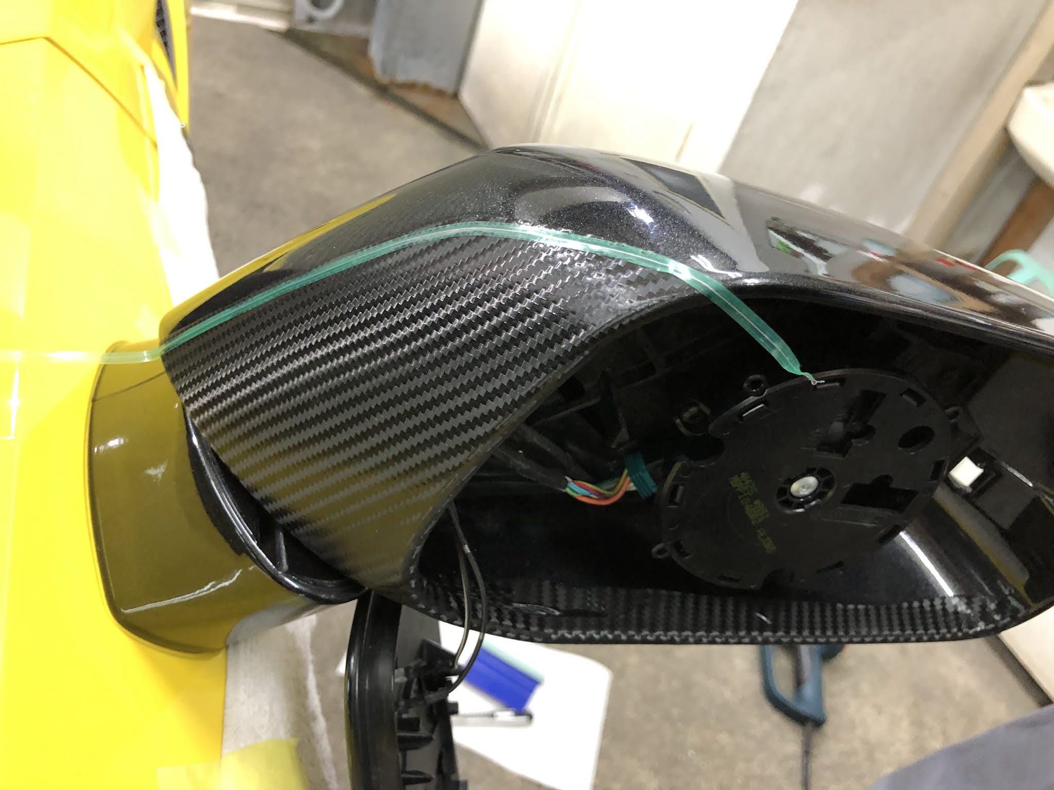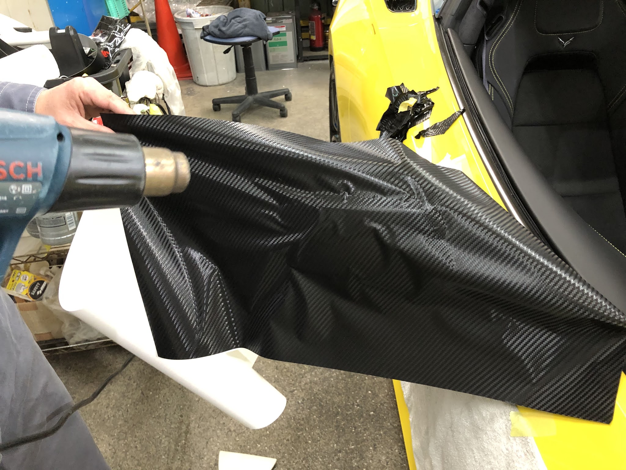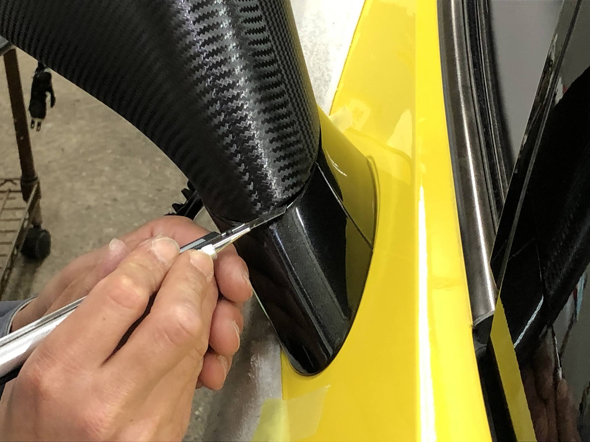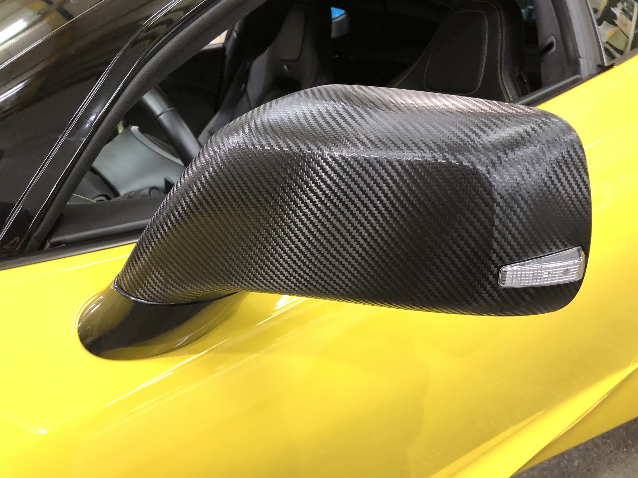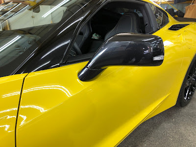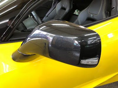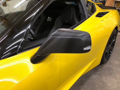 本日はシボレー「コルベット」のドアミラーを黒色からカーボン柄にラッピングしました!