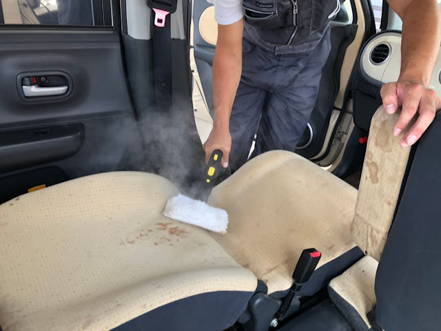 スチーマーを使ってシート表面に付いた汚れを浮かせてどんどん取っていきます!