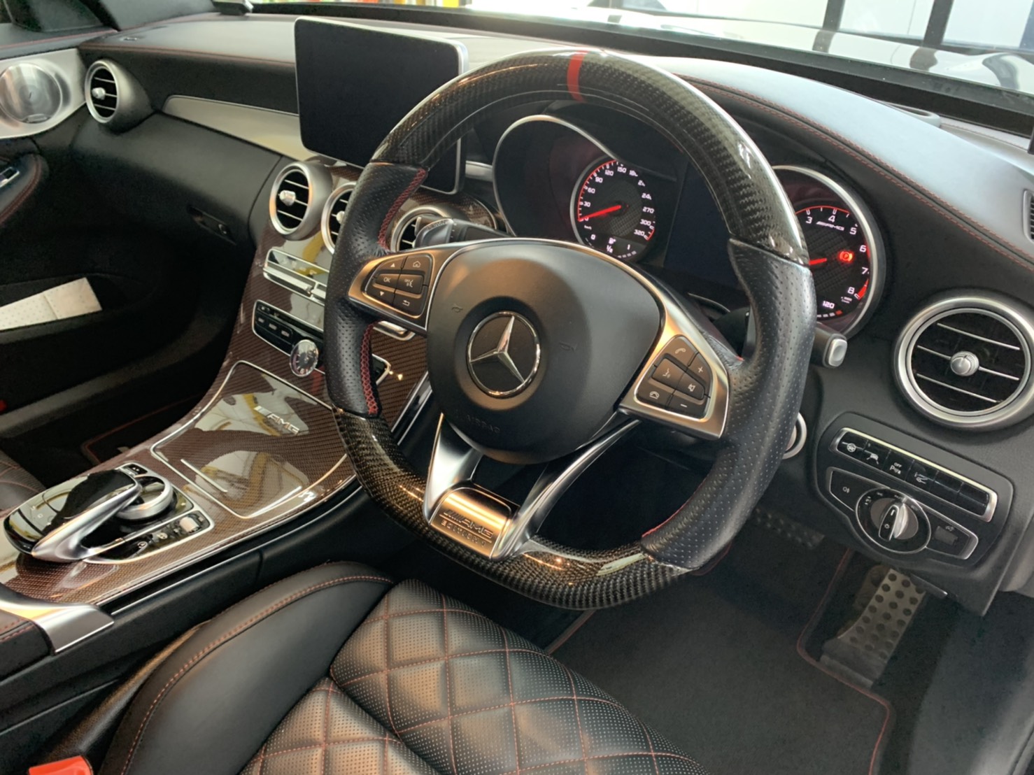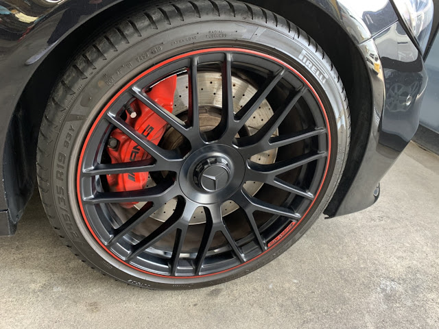 ホイールは19インチ、赤いAMGのキャリパーが目立ちます。