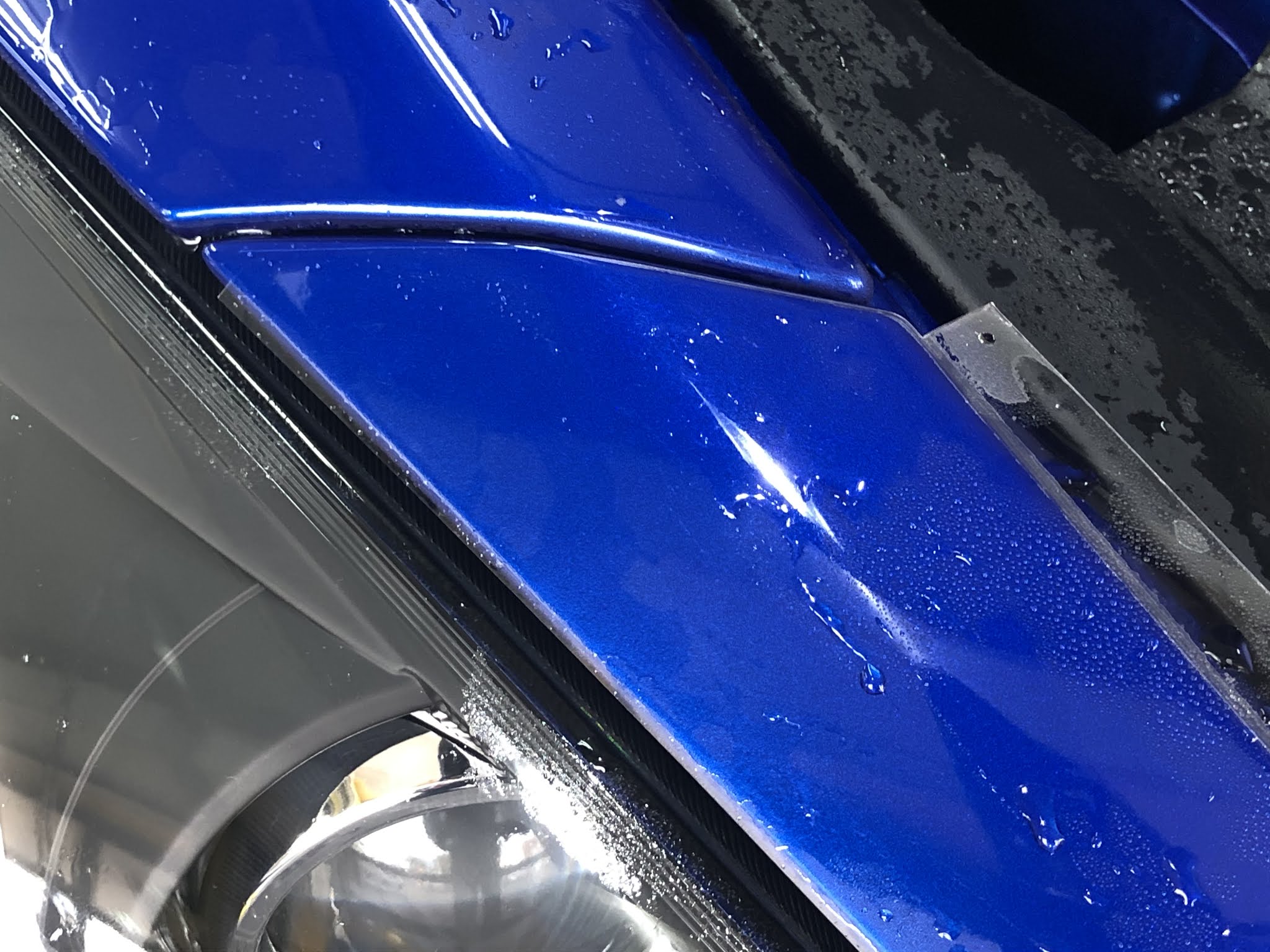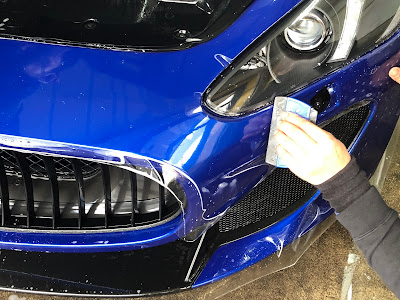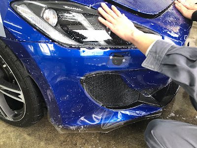 本日はマセラティ「グラントゥーリズモ」のフロントバンパにプロテクションフィルムを施工しました!プロテクションフィルムは透明のフィルムで貼っていることを感じさせないフィルムですが、厚みのある特殊なフィルムです。走行中の飛び石キズなどからボディを守ります。