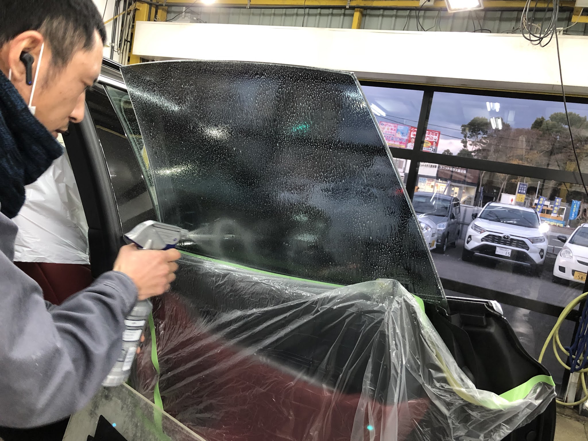 施工風景です。まず施工液をたっぷりかけてガラス面の掃除をし貼る準備をします。