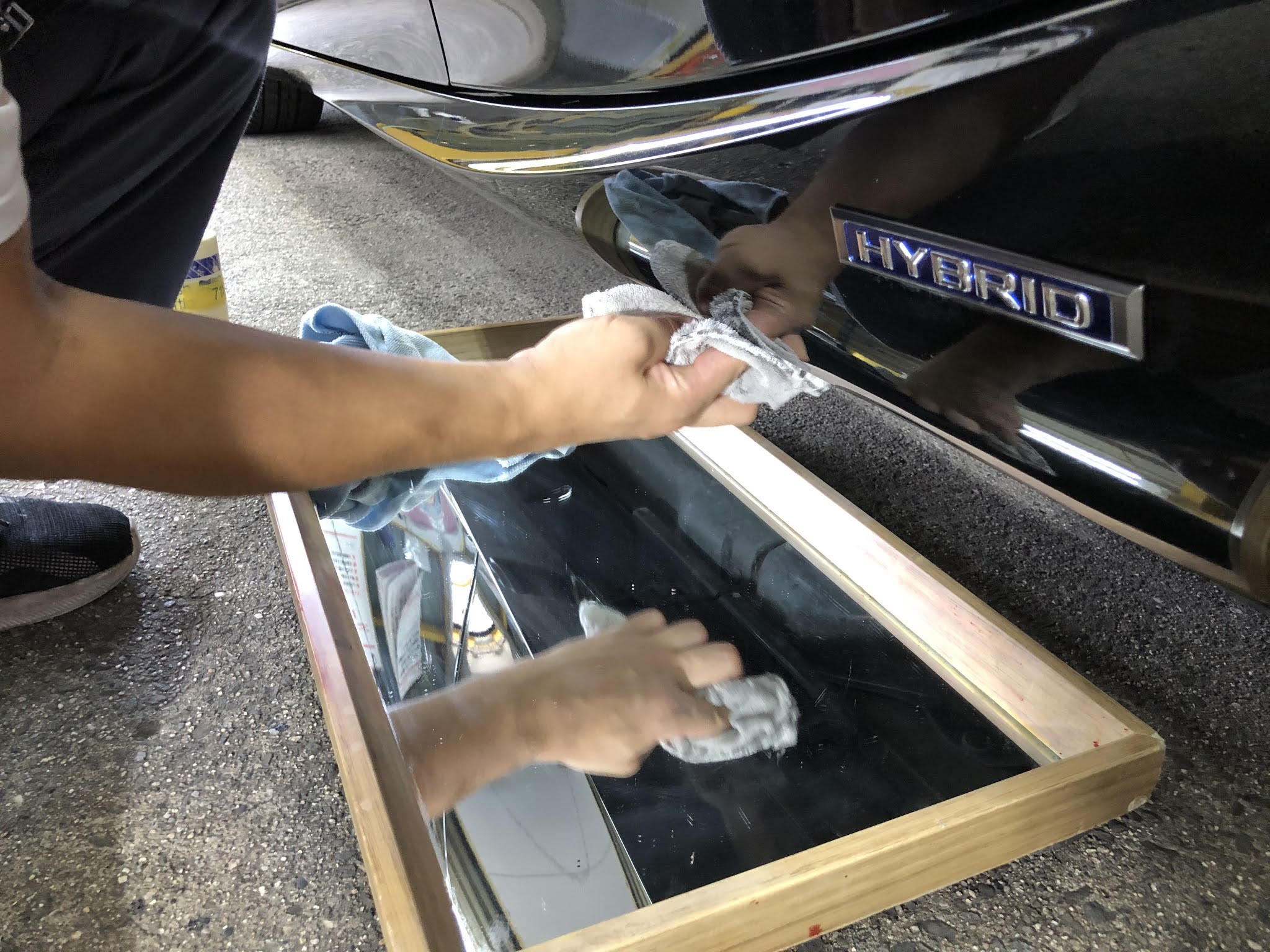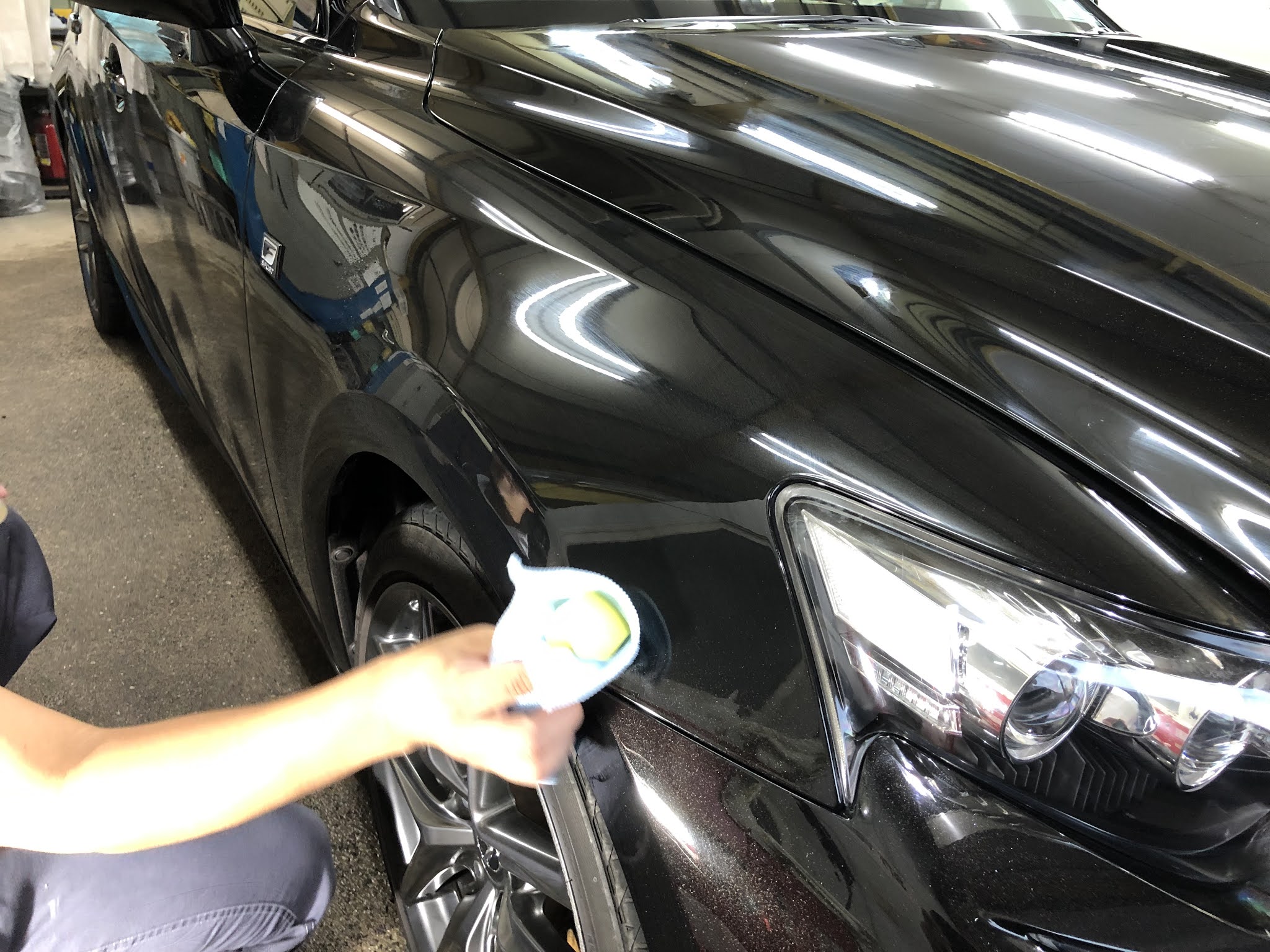 一度仕上がる前にお客様が見に来られて「新車のようにキレイやなー」と言っていただけました。まだその時は磨きが終わったところで、コーティング前でしたので仕上がりを見ていただいた時はより一層キレイになったところを見て頂けたかと思います。特に濃色車はビックリするくらいキレイになりますので是非ご検討下さい。